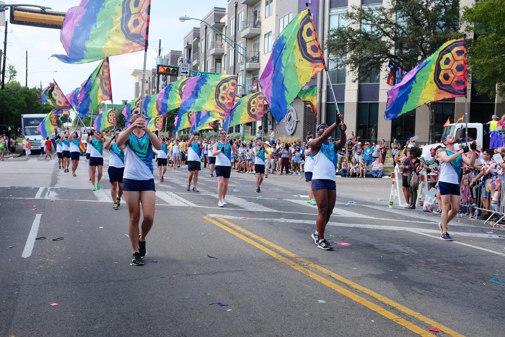 Based in Dallas, The Big D Flag Corps brings together LGBTQ+ individuals to celebrate community through vibrant color guard performances across Texas. Originally founded in 2017 as the "Betsy Ross Fan Club," the group officially incorporated as the Big D Flag Corps in 2024. They have since dazzled audiences at Pride parades in both Dallas and Austin.